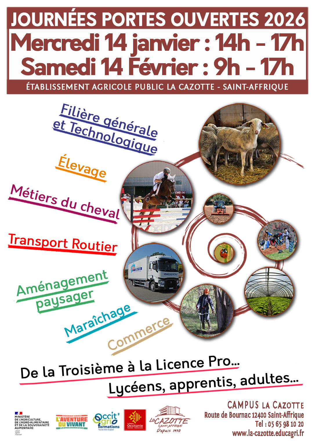 Les Journées Portes Ouvertes de la Cazotte se dérouleront le mercredi 14 janvier 2026 de 14h à 17h et le samedi 14 février 2026 de 9h à 17h pour toutes les filières du lycée, CFA et CFPPA.